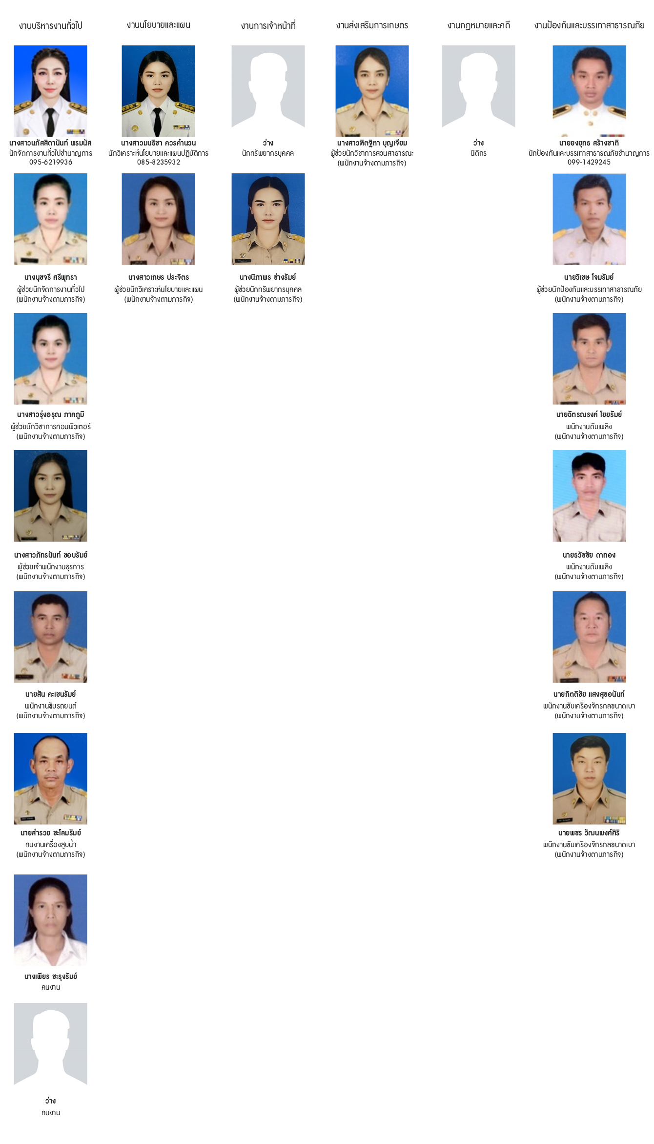 ประกอบด้วย งานบริหารงานทั่วไป,งานการเจ้าหน้าที่,งานแผนงานและงบประมาณ,งานป้องกันและบรรเทาสาธารณภัย,