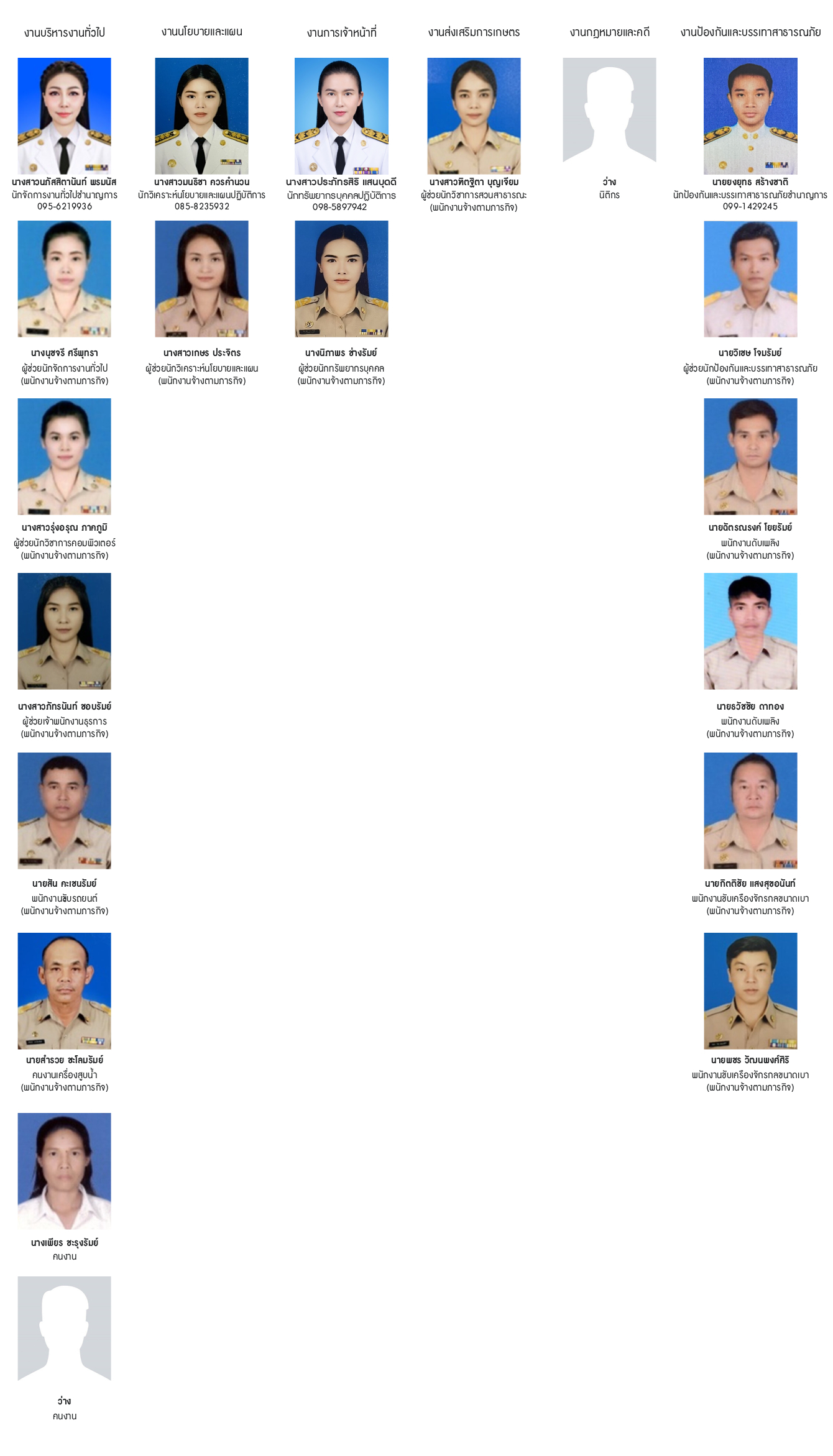 ประกอบด้วย งานบริหารงานทั่วไป,งานการเจ้าหน้าที่,งานแผนงานและงบประมาณ,งานป้องกันและบรรเทาสาธารณภัย,งานส่งเสริมการเกษตร