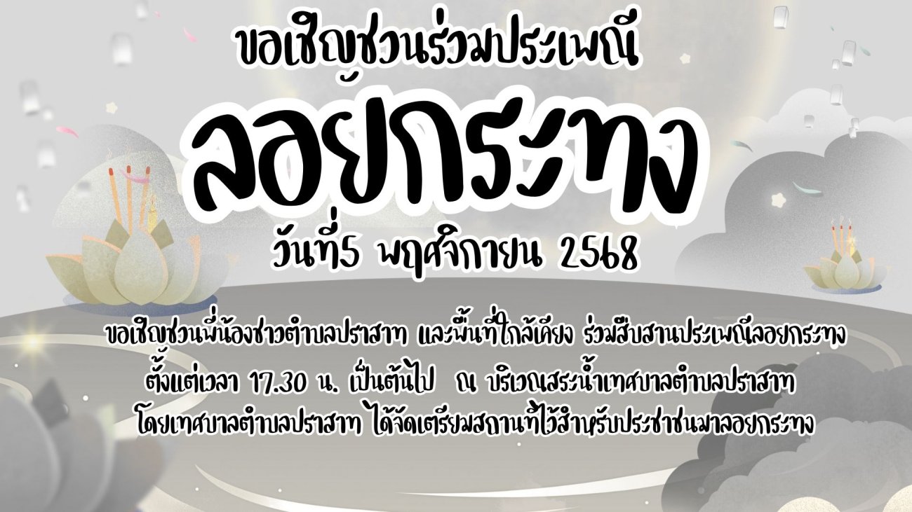 ขอเชิญชวนพี่น้องชาวตำบลปราสาท และพื้นที่ใกล้เคียง ร่วมสืบสานประเพณีลอยกระทง วันนี้เวลา 17.30 น. เป็นต้นไป ณ บริเวณสระน้ำเทศบาลตำบลปราสาท