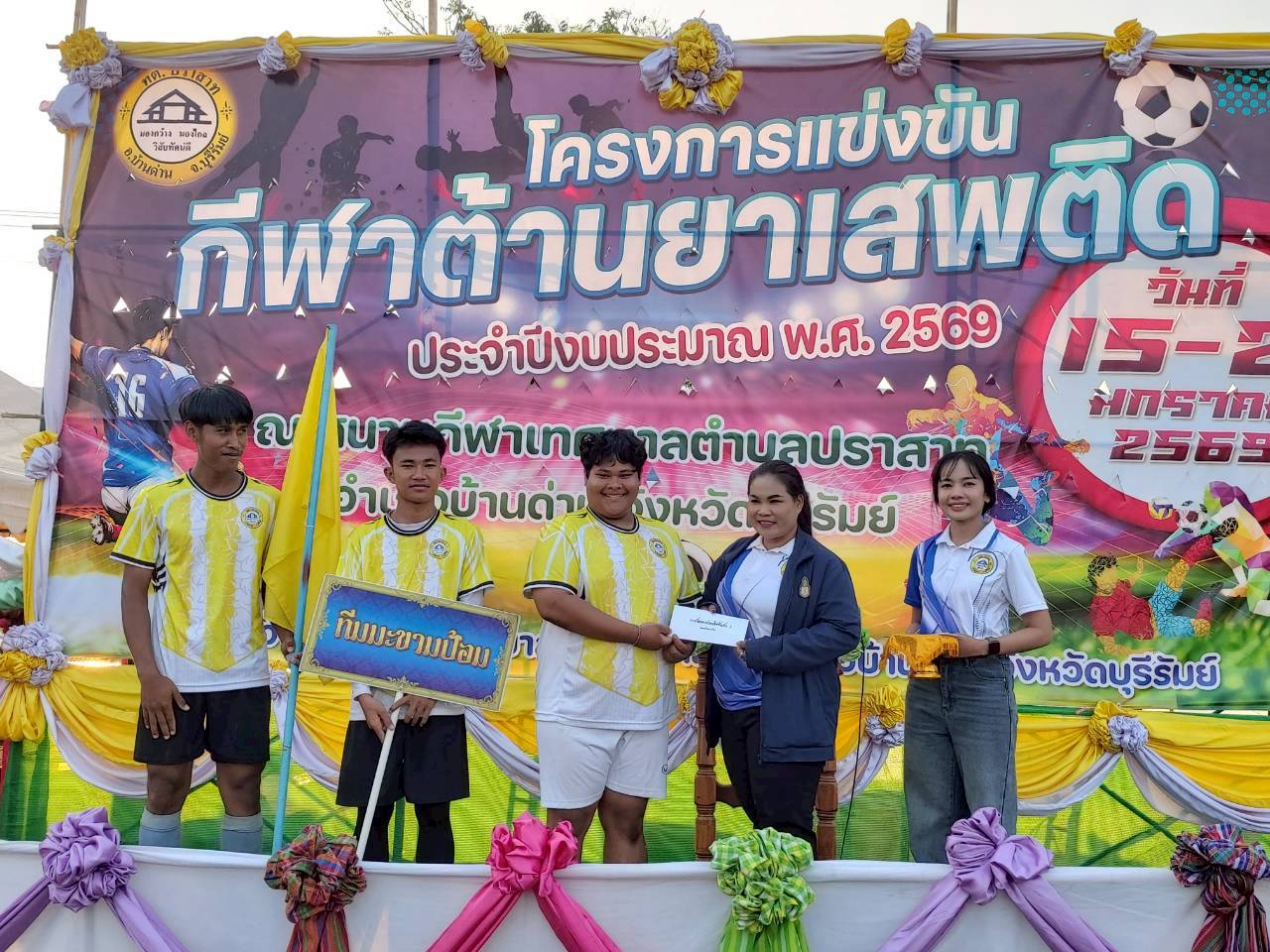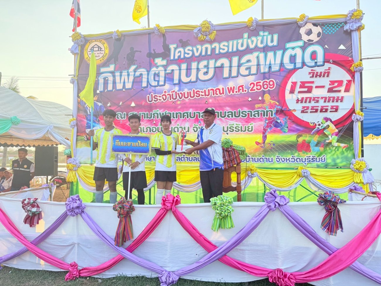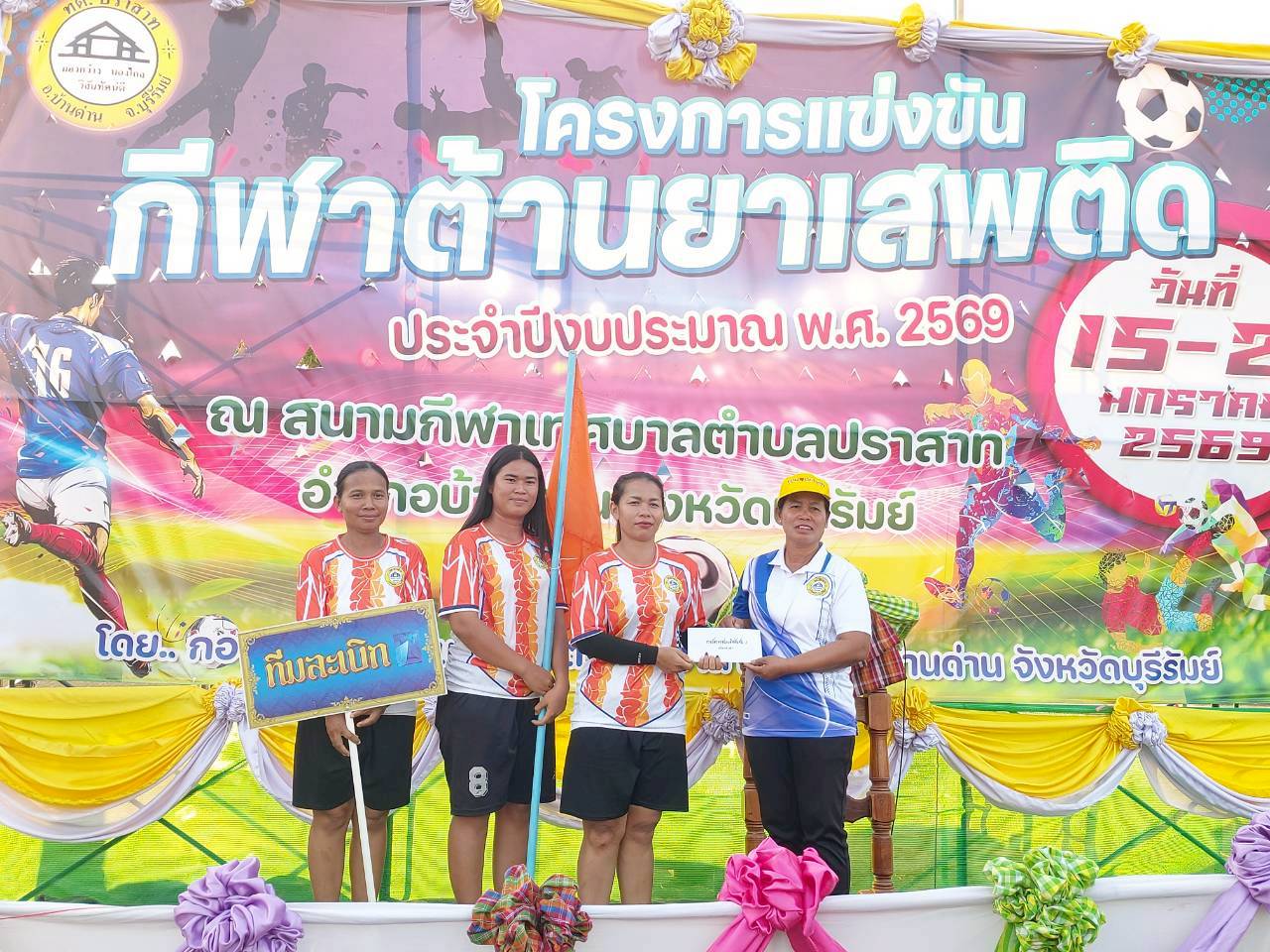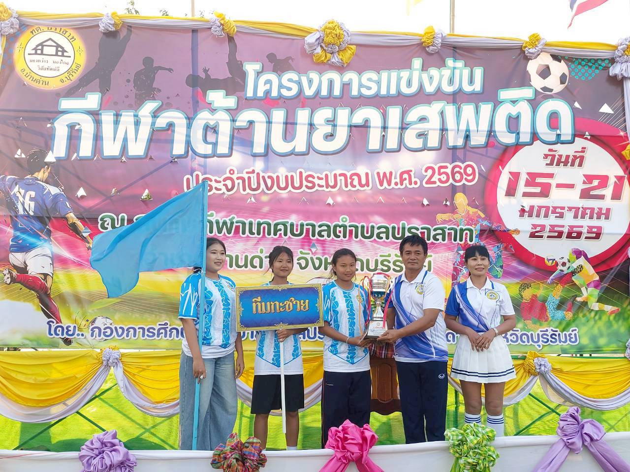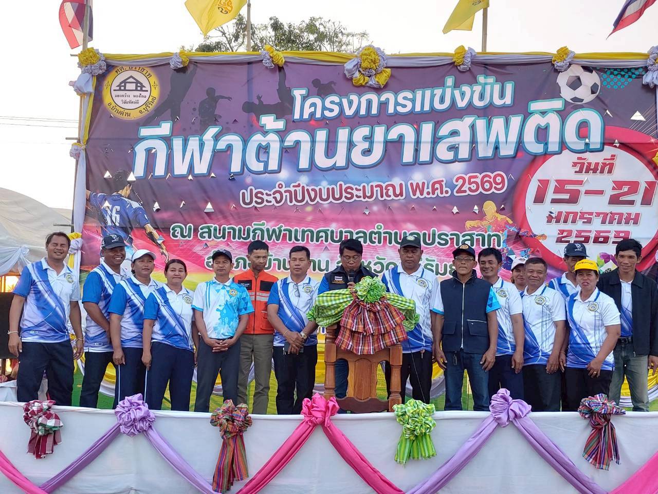ภาพที่เกี่ยวข้อง เมื่อวันที่ 21 มกราคม พ.ศ.2569 นายพนาพัฒน์ ชะลุนรัมย์ นายกเทศมนตรีตำบลปราสาท ประธานจัดการแข่งขันกีฬาต้านยาเสพติดตำบลปราสาท ได้กล่าวรายงานผลการดำเนินการจัดโครงการแข่งขันกีฬาต้านยาเสพติด โดย นายกิตติวัฒน์ ปิติเรืองสิทธิ์ รองปลัดเทศบาล ปฏิบัติราชการแทน ปลัดเทศบาลตำบลปราสาท พร้อมด้วยคณะผู้บริหาร สมาชิกสภาเทศบาล หัวหน้าส่วนราชการ พนักงานเทศบาลตำบลปราสาท กำนัน ผู้ใหญ่บ้าน ทั้ง 18 หมู่บ้าน และนักกีฬาตำบลปราสาท ให้เกียรติร่วมพิธีปิด "โครงการแข่งขันกีฬาต้านยาเสพติดตำบลปราสาท ประจำปีงบประมาณ 2569 ในการแข่งขันกีฬาต้านยาเสพติดตำบลปราสาท ประจำปีงบประมาณ 2569 นี้ ในระหว่างวันที่ 15-21 มกราคม 2569 ณ สนามกีฬาเทศบาลตำบลปราสาท อำเภอบ้านด่าน จังหวัดบุรีรัมย์ ซึ่งได้ดำเนินการจัดการแข่งขันเสร็จสิ้นเป็นที่เรียบร้อย และเป็นไปตามวัตถุประประสงค์ทุกประการ