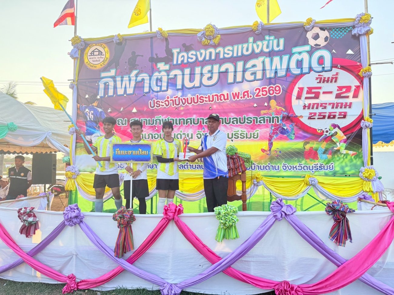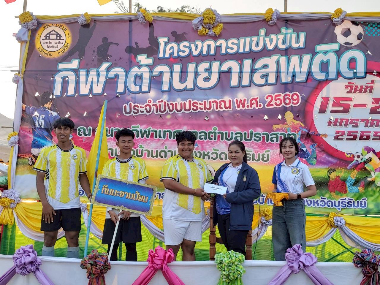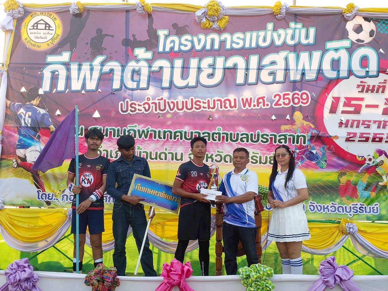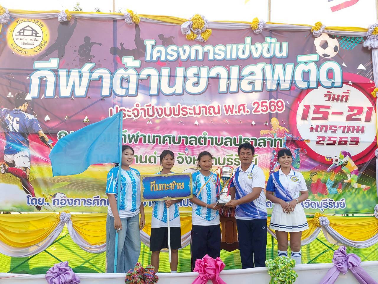 ภาพที่เกี่ยวข้อง เมื่อวันที่ 21 มกราคม พ.ศ.2569 นายพนาพัฒน์ ชะลุนรัมย์ นายกเทศมนตรีตำบลปราสาท ประธานจัดการแข่งขันกีฬาต้านยาเสพติดตำบลปราสาท ได้กล่าวรายงานผลการดำเนินการจัดโครงการแข่งขันกีฬาต้านยาเสพติด โดย นายกิตติวัฒน์ ปิติเรืองสิทธิ์ รองปลัดเทศบาล ปฏิบัติราชการแทน ปลัดเทศบาลตำบลปราสาท พร้อมด้วยคณะผู้บริหาร สมาชิกสภาเทศบาล หัวหน้าส่วนราชการ พนักงานเทศบาลตำบลปราสาท กำนัน ผู้ใหญ่บ้าน ทั้ง 18 หมู่บ้าน และนักกีฬาตำบลปราสาท ให้เกียรติร่วมพิธีปิด "โครงการแข่งขันกีฬาต้านยาเสพติดตำบลปราสาท ประจำปีงบประมาณ 2569 ในการแข่งขันกีฬาต้านยาเสพติดตำบลปราสาท ประจำปีงบประมาณ 2569 นี้ ในระหว่างวันที่ 15-21 มกราคม 2569 ณ สนามกีฬาเทศบาลตำบลปราสาท อำเภอบ้านด่าน จังหวัดบุรีรัมย์ ซึ่งได้ดำเนินการจัดการแข่งขันเสร็จสิ้นเป็นที่เรียบร้อย และเป็นไปตามวัตถุประประสงค์ทุกประการ