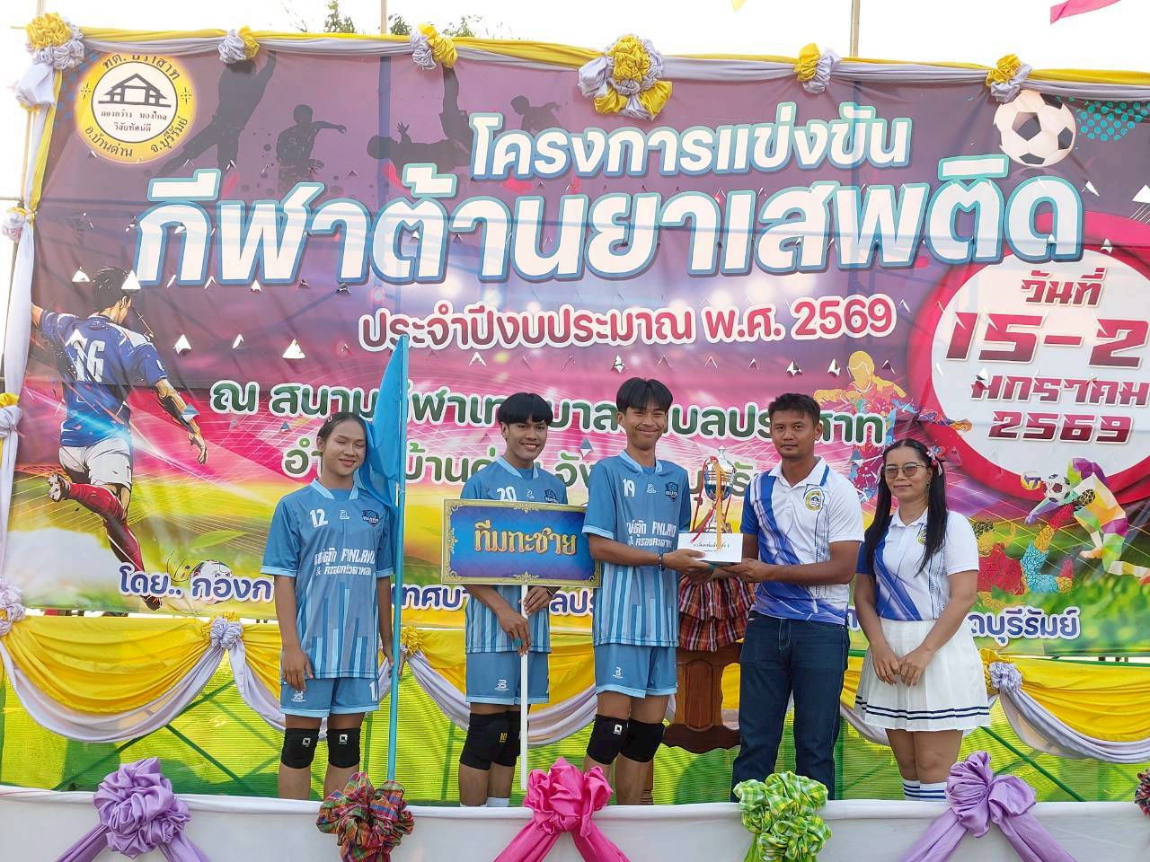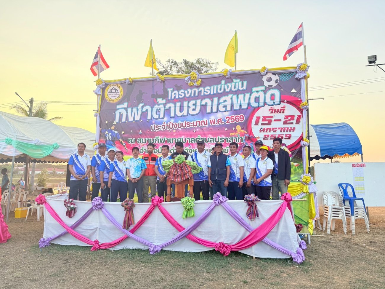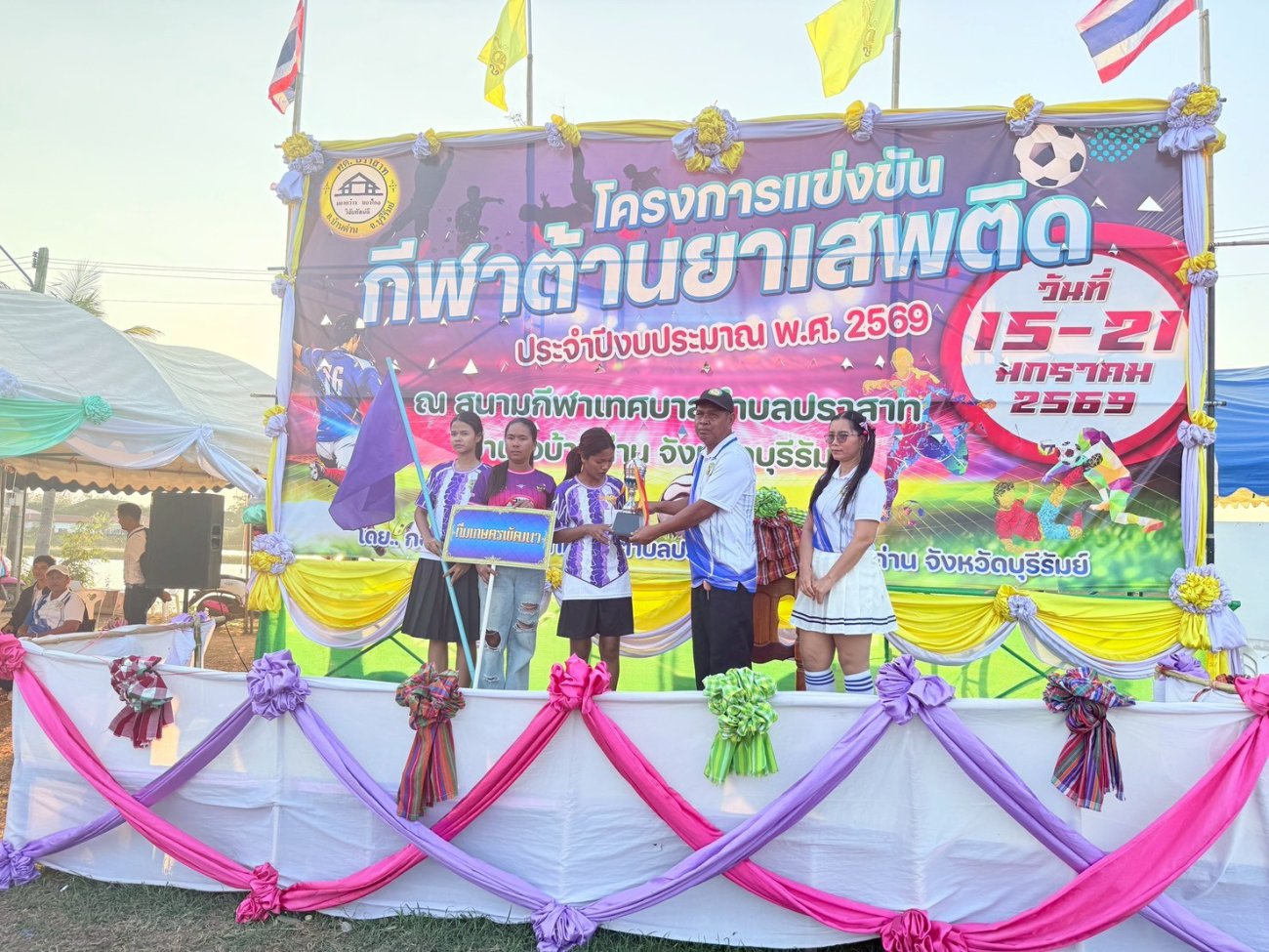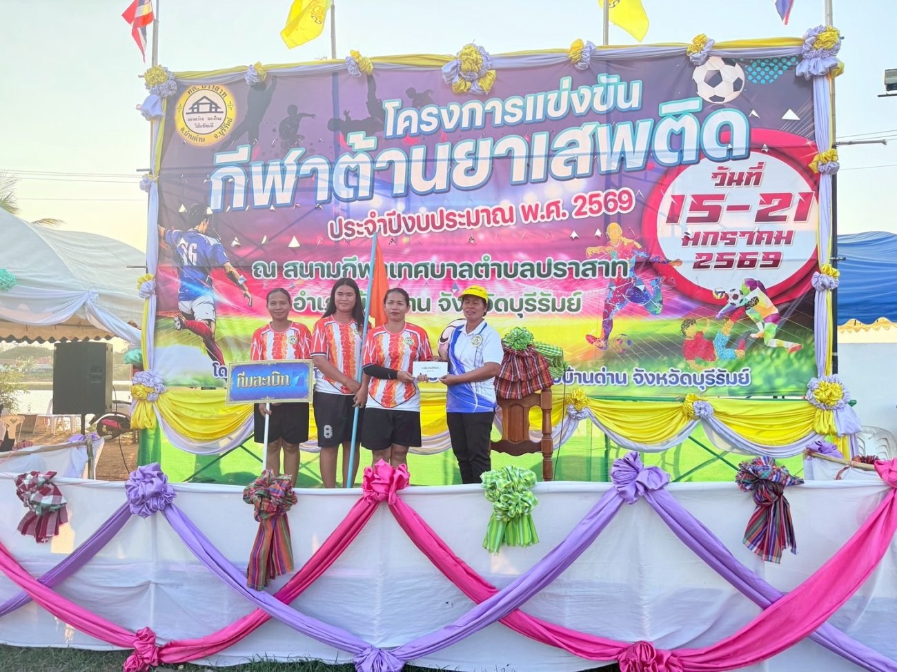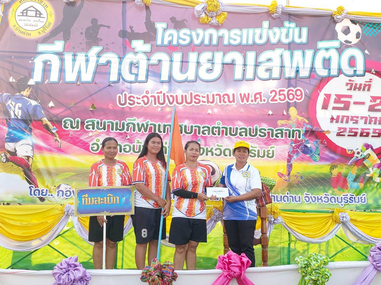 ภาพที่เกี่ยวข้อง เมื่อวันที่ 21 มกราคม พ.ศ.2569 นายพนาพัฒน์ ชะลุนรัมย์ นายกเทศมนตรีตำบลปราสาท ประธานจัดการแข่งขันกีฬาต้านยาเสพติดตำบลปราสาท ได้กล่าวรายงานผลการดำเนินการจัดโครงการแข่งขันกีฬาต้านยาเสพติด โดย นายกิตติวัฒน์ ปิติเรืองสิทธิ์ รองปลัดเทศบาล ปฏิบัติราชการแทน ปลัดเทศบาลตำบลปราสาท พร้อมด้วยคณะผู้บริหาร สมาชิกสภาเทศบาล หัวหน้าส่วนราชการ พนักงานเทศบาลตำบลปราสาท กำนัน ผู้ใหญ่บ้าน ทั้ง 18 หมู่บ้าน และนักกีฬาตำบลปราสาท ให้เกียรติร่วมพิธีปิด "โครงการแข่งขันกีฬาต้านยาเสพติดตำบลปราสาท ประจำปีงบประมาณ 2569 ในการแข่งขันกีฬาต้านยาเสพติดตำบลปราสาท ประจำปีงบประมาณ 2569 นี้ ในระหว่างวันที่ 15-21 มกราคม 2569 ณ สนามกีฬาเทศบาลตำบลปราสาท อำเภอบ้านด่าน จังหวัดบุรีรัมย์ ซึ่งได้ดำเนินการจัดการแข่งขันเสร็จสิ้นเป็นที่เรียบร้อย และเป็นไปตามวัตถุประประสงค์ทุกประการ