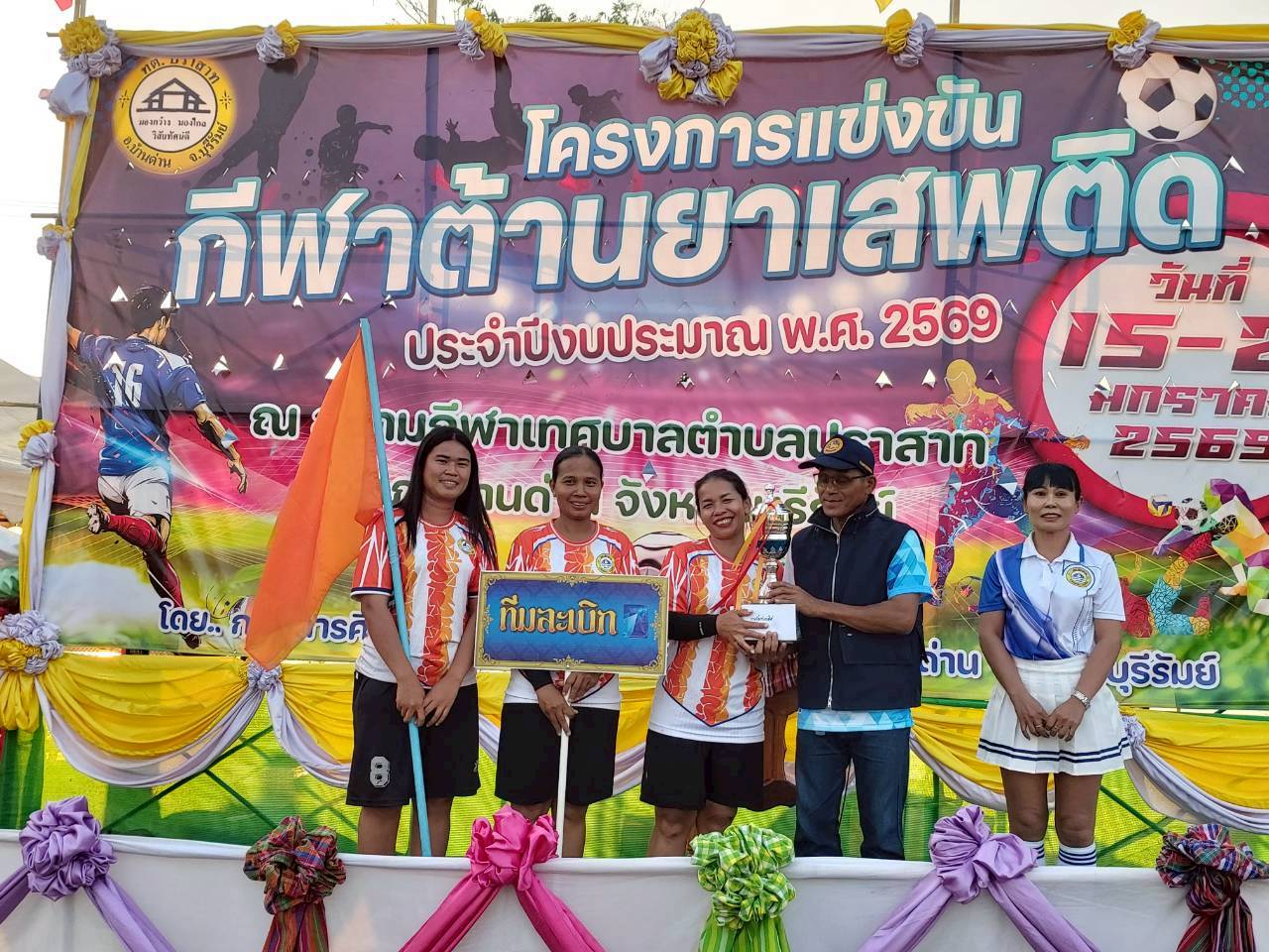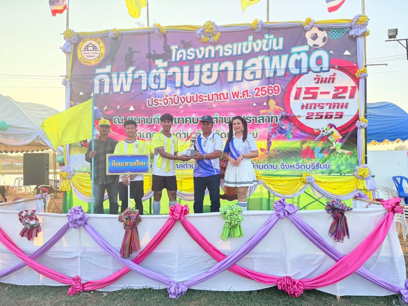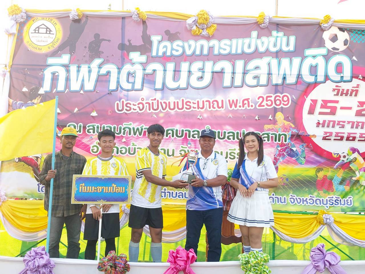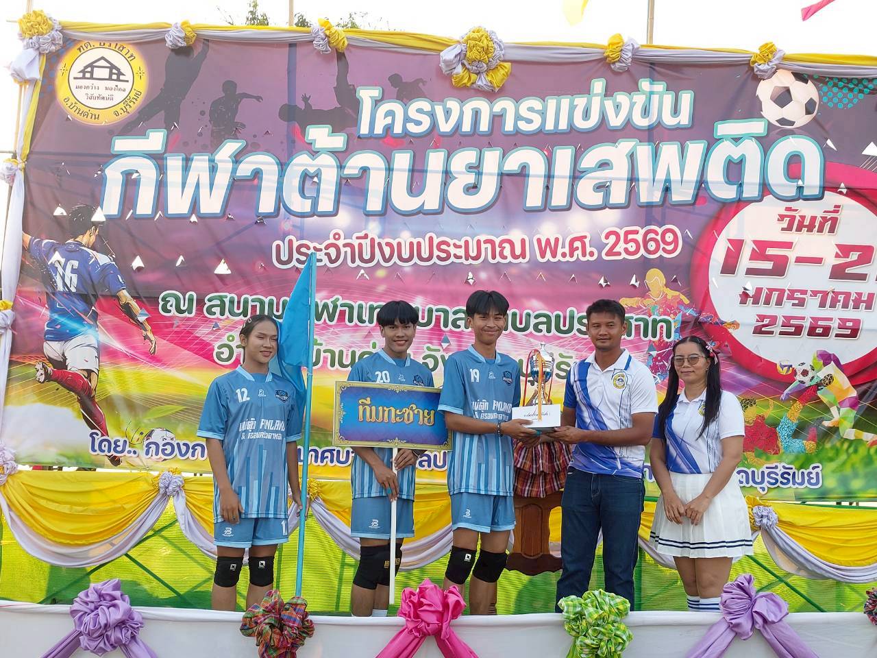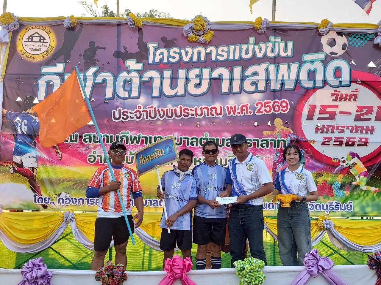 ภาพที่เกี่ยวข้อง เมื่อวันที่ 21 มกราคม พ.ศ.2569 นายพนาพัฒน์ ชะลุนรัมย์ นายกเทศมนตรีตำบลปราสาท ประธานจัดการแข่งขันกีฬาต้านยาเสพติดตำบลปราสาท ได้กล่าวรายงานผลการดำเนินการจัดโครงการแข่งขันกีฬาต้านยาเสพติด โดย นายกิตติวัฒน์ ปิติเรืองสิทธิ์ รองปลัดเทศบาล ปฏิบัติราชการแทน ปลัดเทศบาลตำบลปราสาท พร้อมด้วยคณะผู้บริหาร สมาชิกสภาเทศบาล หัวหน้าส่วนราชการ พนักงานเทศบาลตำบลปราสาท กำนัน ผู้ใหญ่บ้าน ทั้ง 18 หมู่บ้าน และนักกีฬาตำบลปราสาท ให้เกียรติร่วมพิธีปิด "โครงการแข่งขันกีฬาต้านยาเสพติดตำบลปราสาท ประจำปีงบประมาณ 2569 ในการแข่งขันกีฬาต้านยาเสพติดตำบลปราสาท ประจำปีงบประมาณ 2569 นี้ ในระหว่างวันที่ 15-21 มกราคม 2569 ณ สนามกีฬาเทศบาลตำบลปราสาท อำเภอบ้านด่าน จังหวัดบุรีรัมย์ ซึ่งได้ดำเนินการจัดการแข่งขันเสร็จสิ้นเป็นที่เรียบร้อย และเป็นไปตามวัตถุประประสงค์ทุกประการ