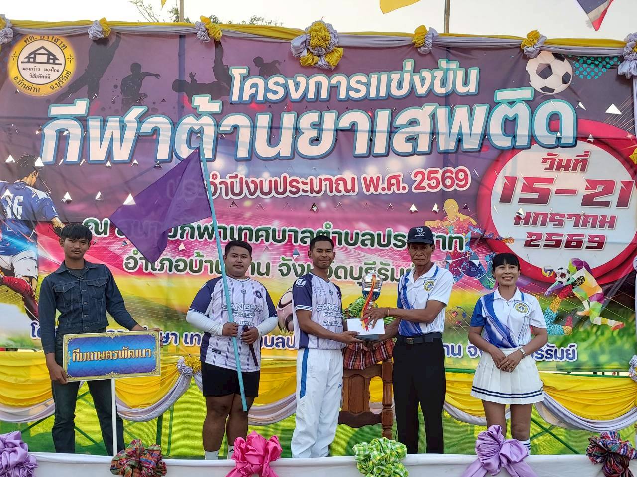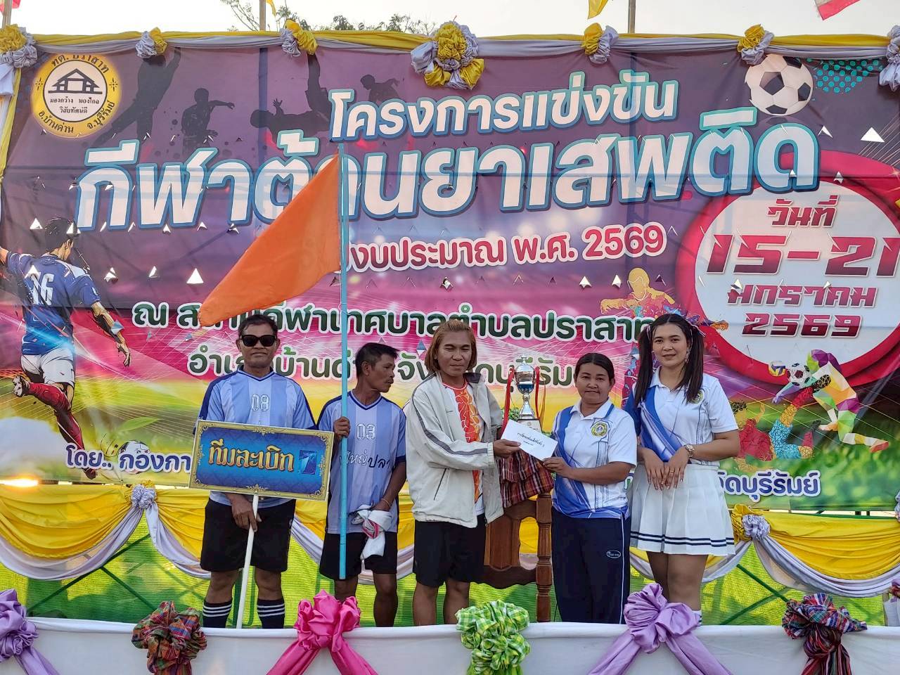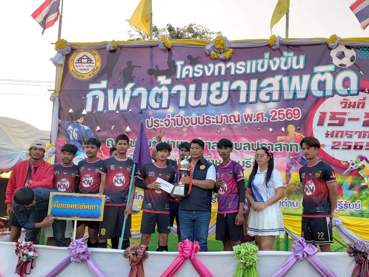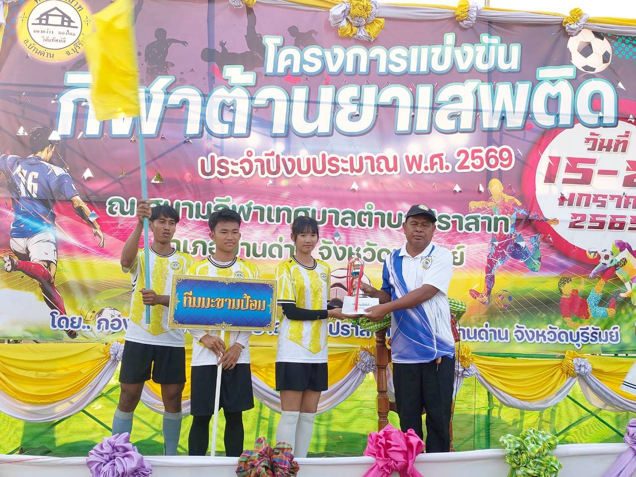 ภาพที่เกี่ยวข้อง เมื่อวันที่ 21 มกราคม พ.ศ.2569 นายพนาพัฒน์ ชะลุนรัมย์ นายกเทศมนตรีตำบลปราสาท ประธานจัดการแข่งขันกีฬาต้านยาเสพติดตำบลปราสาท ได้กล่าวรายงานผลการดำเนินการจัดโครงการแข่งขันกีฬาต้านยาเสพติด โดย นายกิตติวัฒน์ ปิติเรืองสิทธิ์ รองปลัดเทศบาล ปฏิบัติราชการแทน ปลัดเทศบาลตำบลปราสาท พร้อมด้วยคณะผู้บริหาร สมาชิกสภาเทศบาล หัวหน้าส่วนราชการ พนักงานเทศบาลตำบลปราสาท กำนัน ผู้ใหญ่บ้าน ทั้ง 18 หมู่บ้าน และนักกีฬาตำบลปราสาท ให้เกียรติร่วมพิธีปิด "โครงการแข่งขันกีฬาต้านยาเสพติดตำบลปราสาท ประจำปีงบประมาณ 2569 ในการแข่งขันกีฬาต้านยาเสพติดตำบลปราสาท ประจำปีงบประมาณ 2569 นี้ ในระหว่างวันที่ 15-21 มกราคม 2569 ณ สนามกีฬาเทศบาลตำบลปราสาท อำเภอบ้านด่าน จังหวัดบุรีรัมย์ ซึ่งได้ดำเนินการจัดการแข่งขันเสร็จสิ้นเป็นที่เรียบร้อย และเป็นไปตามวัตถุประประสงค์ทุกประการ